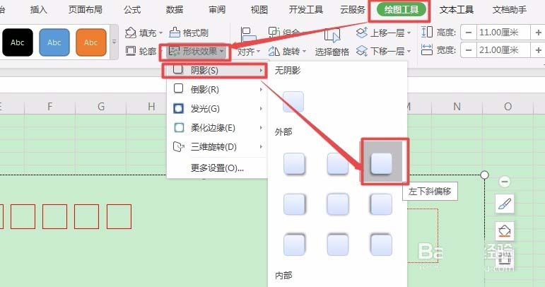 7、点击信封框架,选择【绘图工具】,点击【形状效果】,在点击【阴影】,之后选择【左下斜偏移】。
