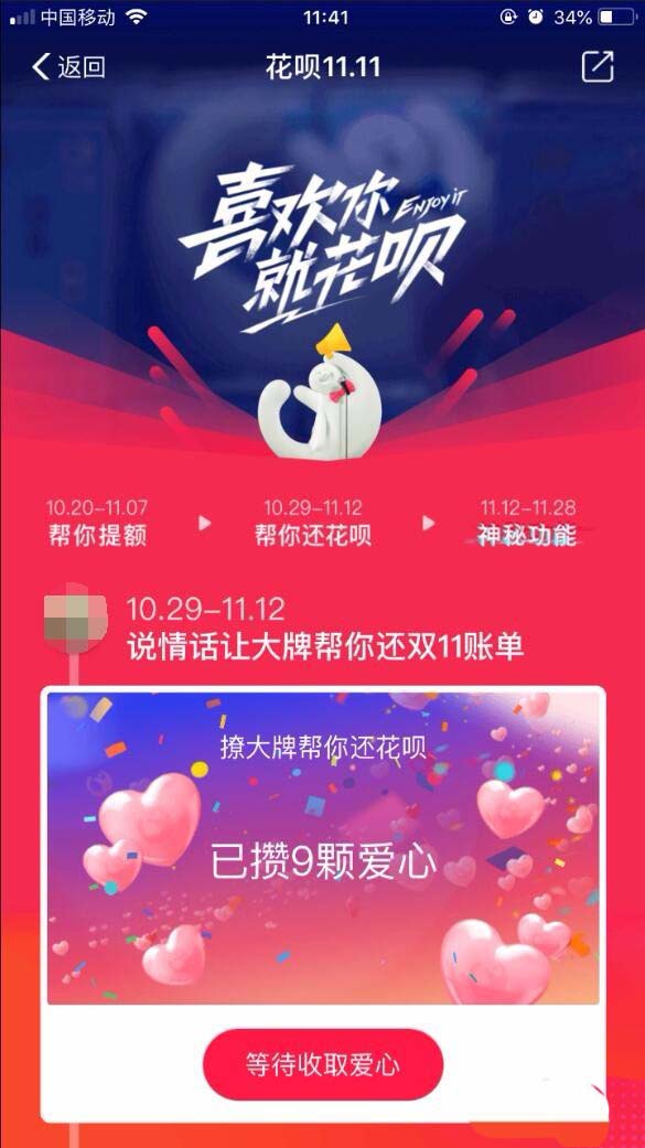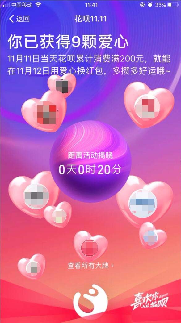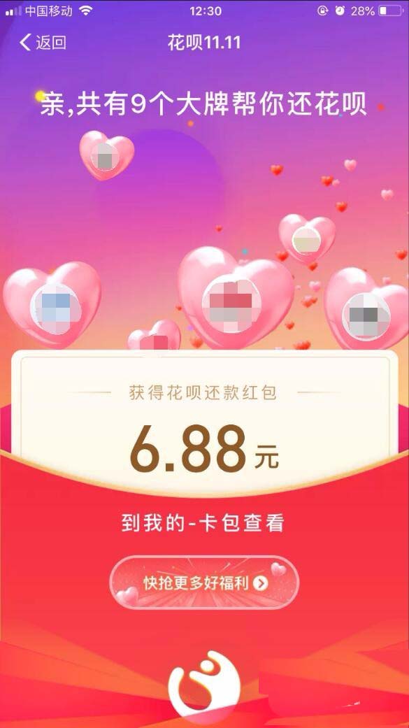 6、等待开启时间到达后,所有的爱心就会自动开启,同时我们就可以获得对应的花呗红包,花呗红包可以直接在花呗还款时使用,并且只能用于花呗。