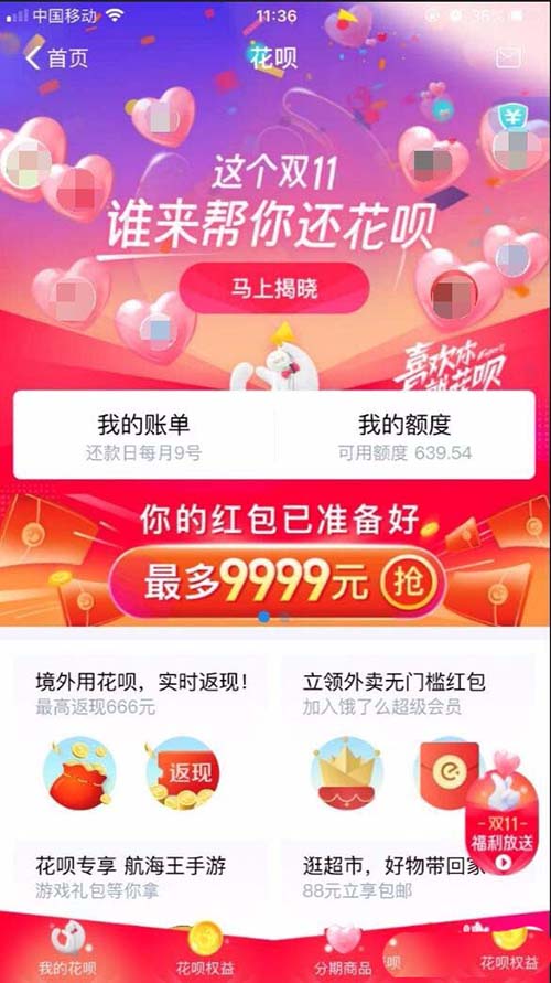 2、在花呗的首页,我们即可在最上面看到花呗的双十一活动——谁爱帮你还花呗,我们直接点击进入。