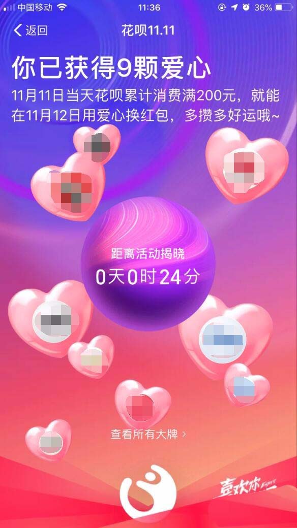 5、所有的爱心将会在12号的12点开启,每一个爱心最多可以开启1111元的花呗红包,但是多数还是以小红包为主。