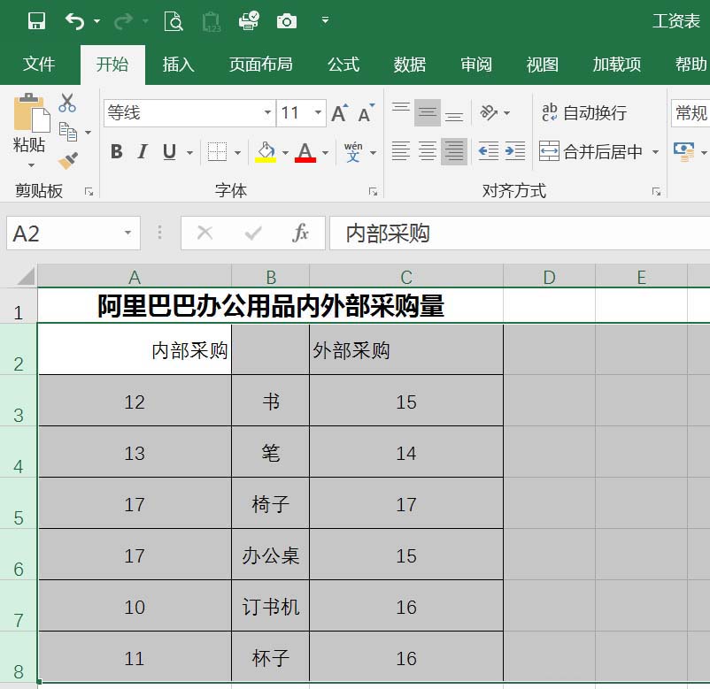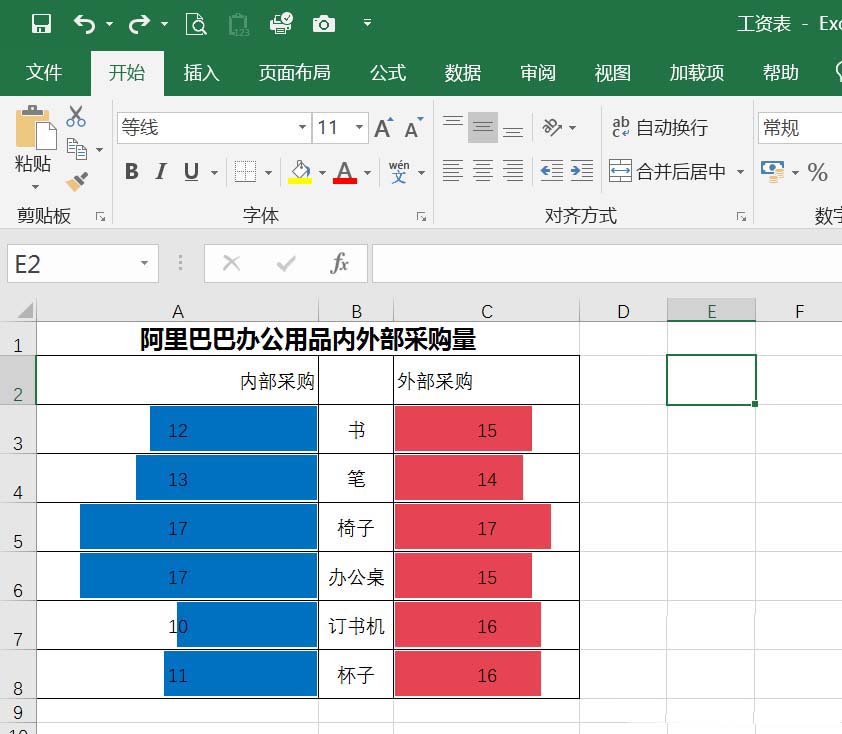 1、以下表为例,对阿里巴巴办公用品采购量作对比条形图。