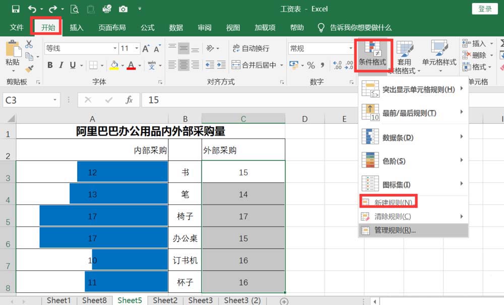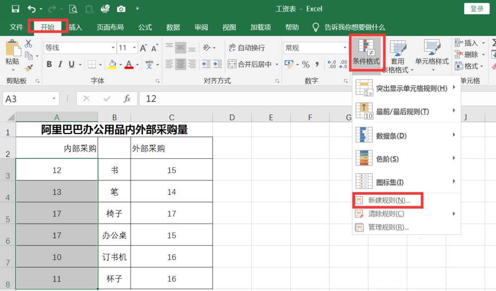 2、选中内部采购的办公用品,依次执行数据--条件格式--新建规则。