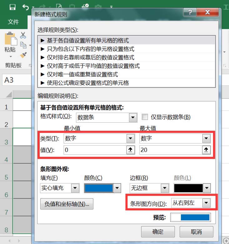 3、在新建规则面板,数字最大值为20,最小值为0,条形方向选择从右至左。