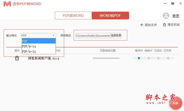 2、更改保存路径和输出格式,输出的格式有:.pdf、PDF/A-1a、PDF/A-2a