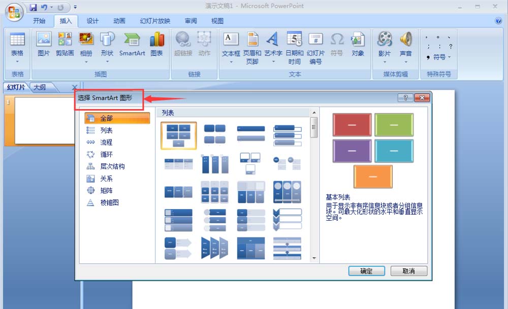 5、点SmartArt,进入选择SmartArt图形对话框;