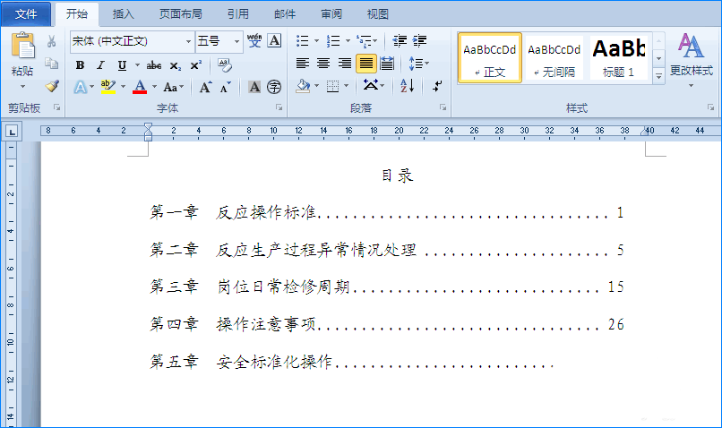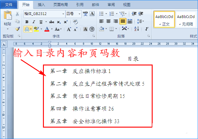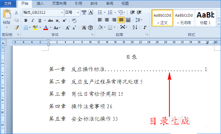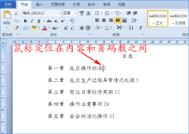 5、返回到文档时,我们先将鼠标定位在目录内容与页码数之间,然后点击键盘上的”Tab“键,这样目录就生成了。如图所示: