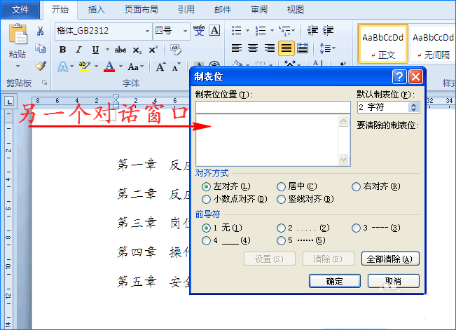 3、在对话窗口中我们点击“制表位”选项,这时又会弹出另一个对话窗口。如图所示: