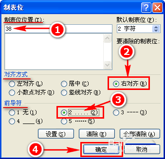 4、在“制表位”对话窗口的“制表位位置”下方方框中输入“38”,对齐方式选择“右对齐“,前导符选择第二种样式”.........(2)“,所有参数选择完成后,我们再点击”确定“。如图所示: