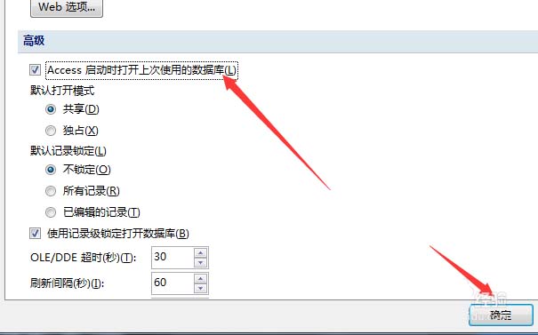 6、勾选上了access启动时打开上次使用的数据库 的选项之后,点击 确定 保存设置。