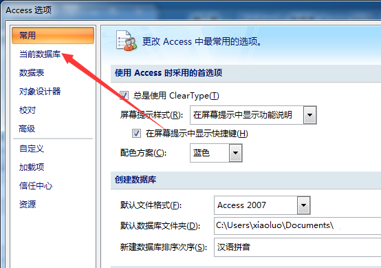 4、弹出了的access选项,选中左侧中的当前数据库的选项。