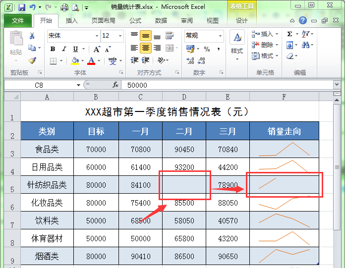 1、在下面的工作表中,因D5单元格的数据为空,从而导致了迷你图中出现断裂的情况,现在我们现处理一下。