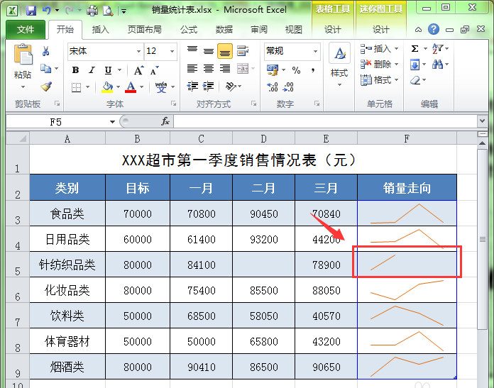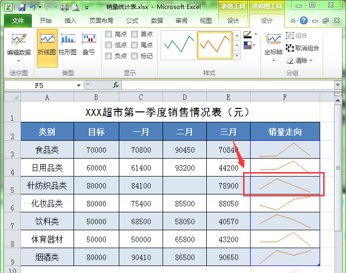 2、选择要处理的迷你图所在的单元格或单元格区域。这里选择F5单元格。