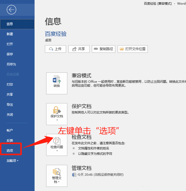 3、在弹出信息窗口中,找到“选项”并左键单击它。