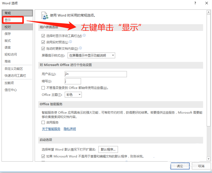 4、在弹出Word选项窗口中,找到"显示"选项并左键单击它。