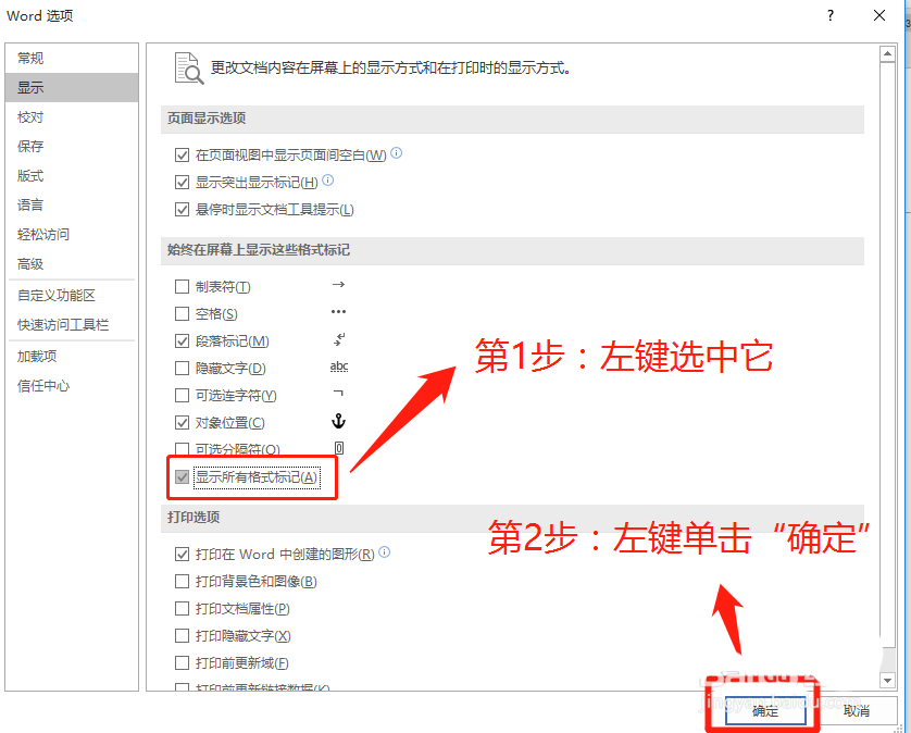 5、在显示的子窗口中,找到“显示所有格式标记”选项并左键选中它,然后左键单击“确定”按钮。