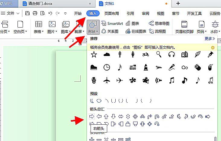 2、在工具栏选择“插入---形状”,在形状中选择“箭头汇总”在其中选择适合自己的箭头;