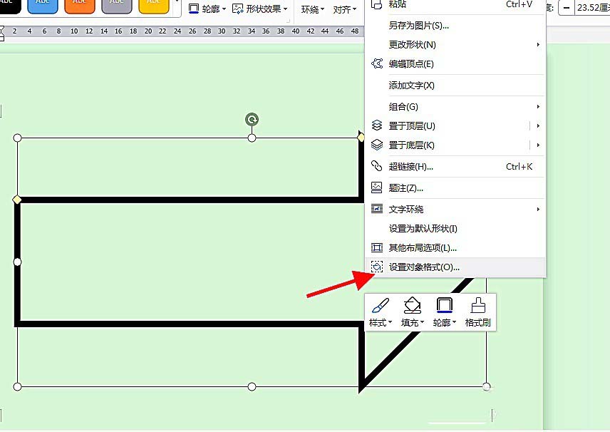 3、如图在空白处画出箭头形状,调整箭头位置及大小,选中箭头标识,右键选择“设置对象格式”;