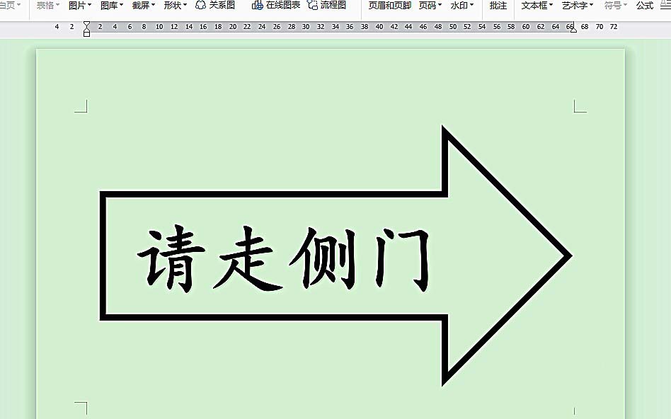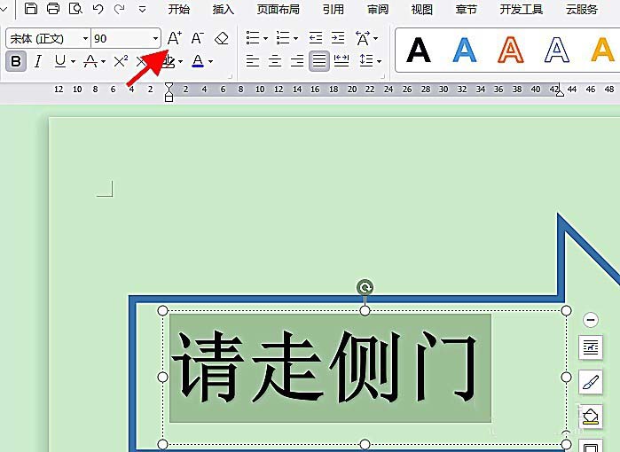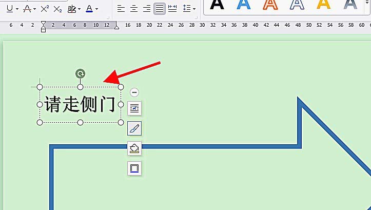 6、在艺术字文本中输入箭头标识语,如“请走侧门”;