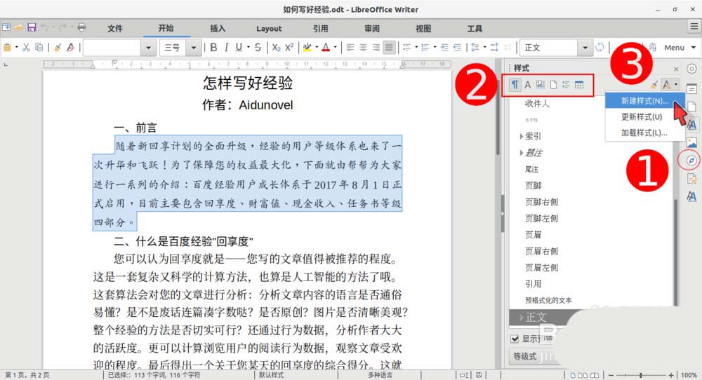 3、在 Writer 右侧的侧边栏中,点击“样式”按钮(红色的序号1的位置➊)进入样式栏,并确保栏上方的工具栏中,第一个按钮“段落”(红色的序号2的位置➋)处于被选中状态。这时,单击栏上方右侧的“基于所选内容创建新样式”按钮(红色的序号3的位置➌),在弹出的菜单中点击“新建样式”菜单项。