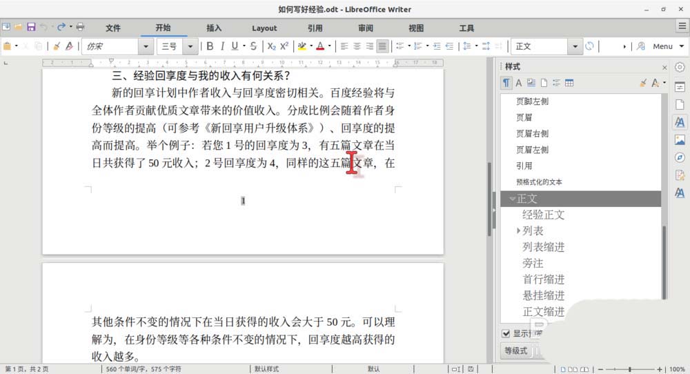 1、现在有一篇文档,它的标题和正文分别应用了“样式1”、“正文”等样式。从这些样式的名称可见,它们都是在 Writer 预置的样式基础上修改而来。