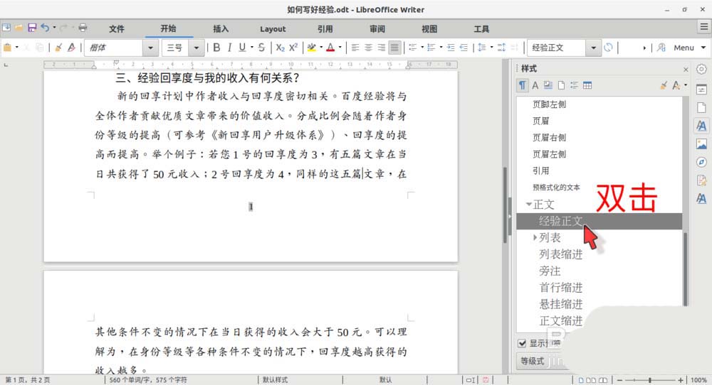 7、然后,再移动鼠标光标到左侧边栏中,在刚刚建好的“经验正文”上双击,上一步骤中的段落样式,即由原来的样式格式,转变为“经验正文”的样式格式。