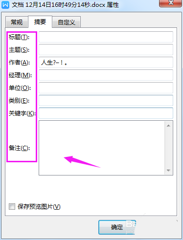 6、【摘要】这里,我们要设置的就很多了,如【主题、标题、作者、经理、类别、关键字】等都可以填写,如图。