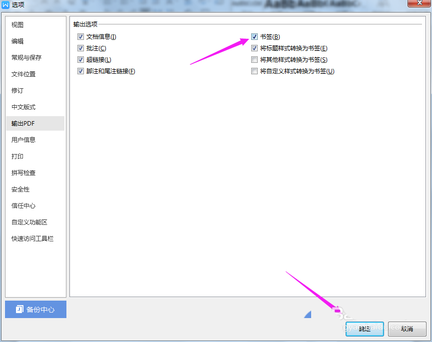 6、那么,这个【书签】,我们就勾选,点【确定】,如图。