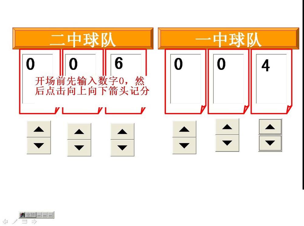 7、最后,按F5观看放映幻灯片,然后在文本框控件那里全部输入0,然后就可以点击上下箭头自动增减数字了进行记分了。(一定要在文本框输入数字,数值调节钮点击才有效)