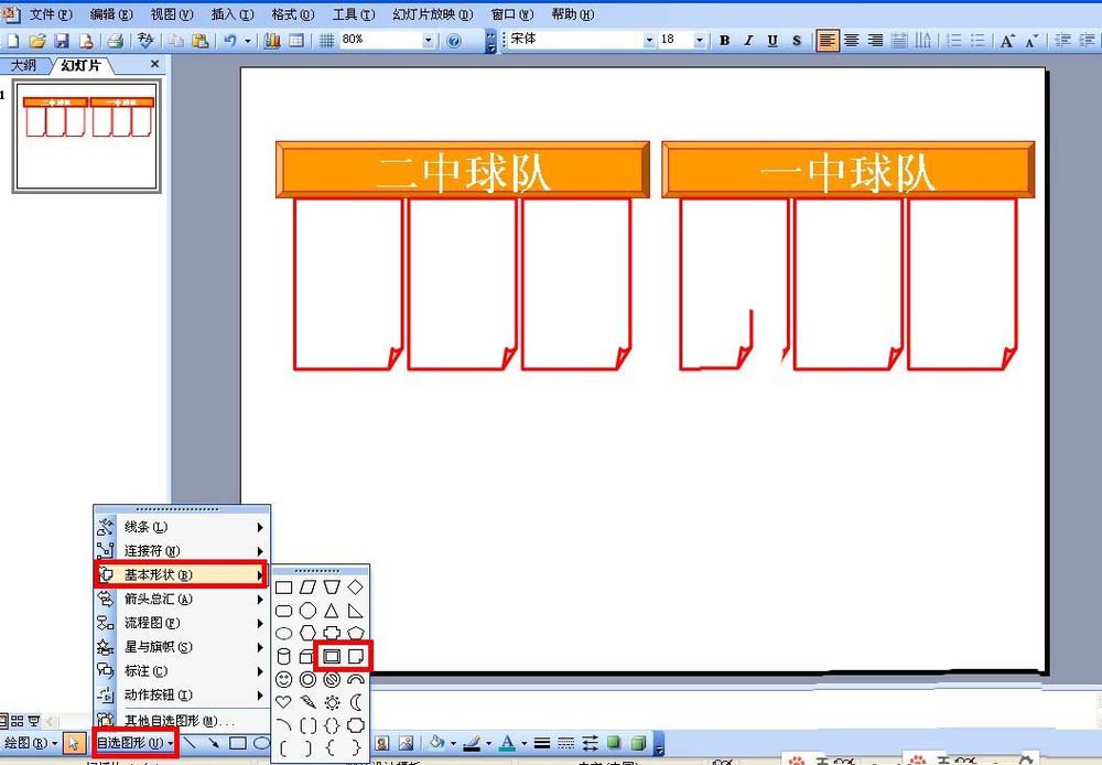 1、小编使用的是PPT2003来制作,在PPT界面点击左下角的自选图形选择棱台和折角形,在编辑界面那里如下图画一个记分牌并调整好大小。然后再在棱台那里输入比赛小组名称并设置字体大小等。