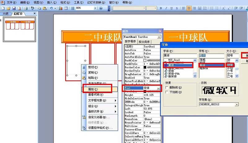 3、右击文本框控件——选择属性——在Font那里点击宋体旁边的三点图标——然后设置好字体、字形和大小等——点击确定。然后把设置好的文本框控件粘贴到其它的折角形那里。