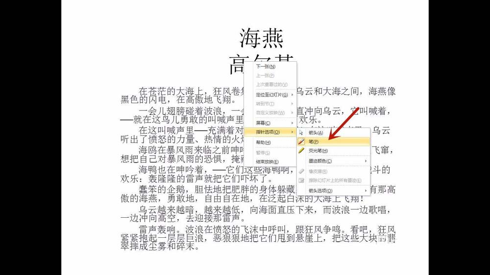 3、打开幻灯片之后右击鼠标选择“指针选项>笔”如图所示