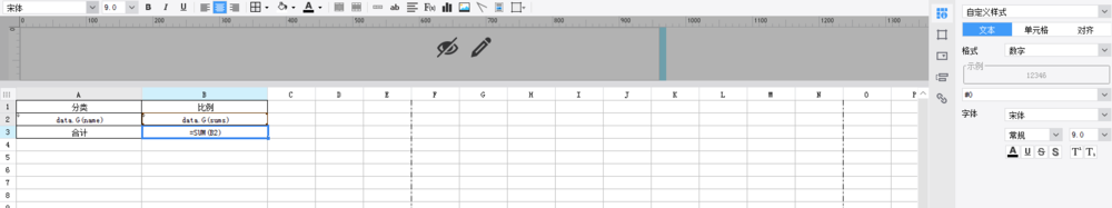 2、在报表单元格中,将内置数据集中的字段拖到A2和B2单元格,A1和B1设置为表头,A3单元格为合计,如下图所示: