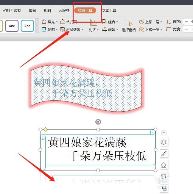 8、在绘图工具中选择形状效果,比如我选了倒影效果