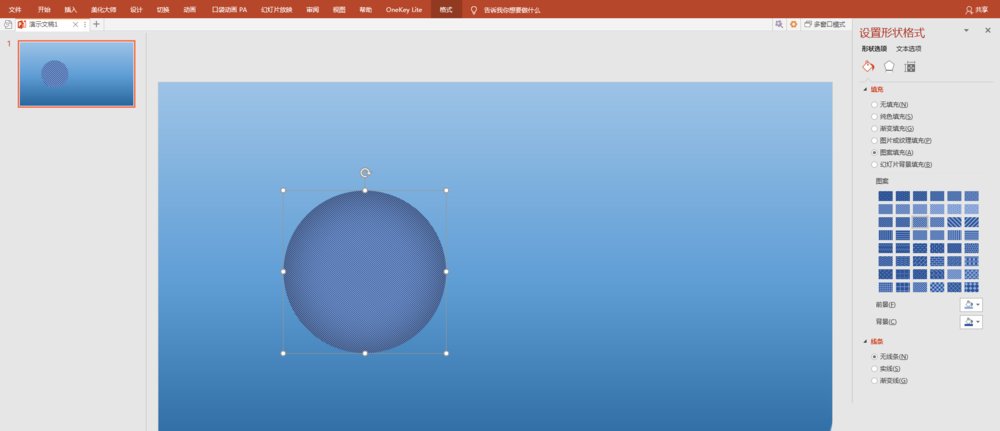 3、设置圆形格式,选择图案填充,斜线花纹,填充颜色与背景颜色相近。
