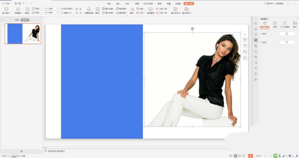 2、插入一张人物素材图片,然后插入一个与幻灯片等高、宽度约为幻灯片二分之一的矩形。