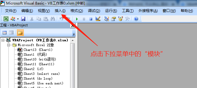 2、在VBA界面,点击菜单栏【插入】,在其下拉菜单中,点击【模块】!