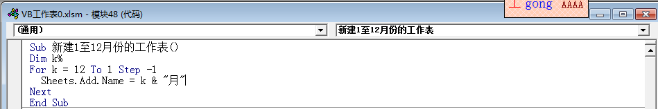 Sub 新建1至12月份的工作表() Dim k% For k = 12 To 1 Step -1 Sheets.Add.Name = k & "月" Next End Sub