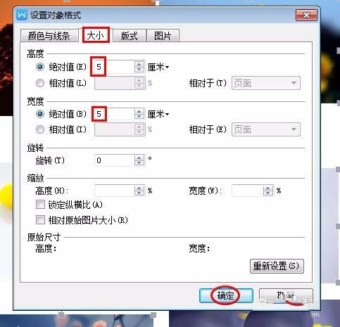 5、切换至“大小”选项卡,根据自己的需要设置图片的高度和宽度,设置完成后单击“确定”按钮。