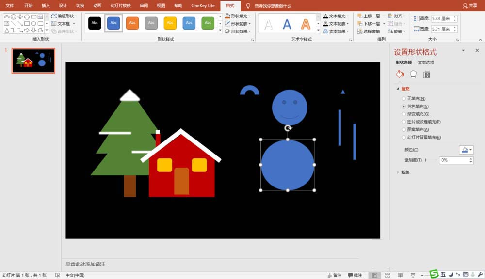 5、插入圆形、笑脸、矩形、空心弧等形状,设置填充颜色,制作雪人。