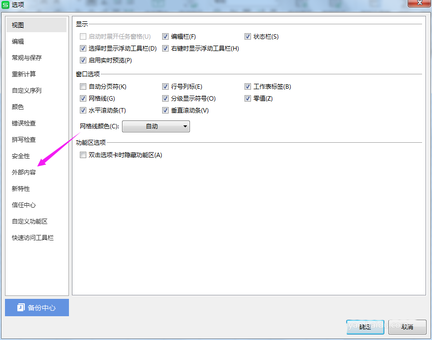 5、【选项】按开下下之后,【外部内容】点触开,如图。
