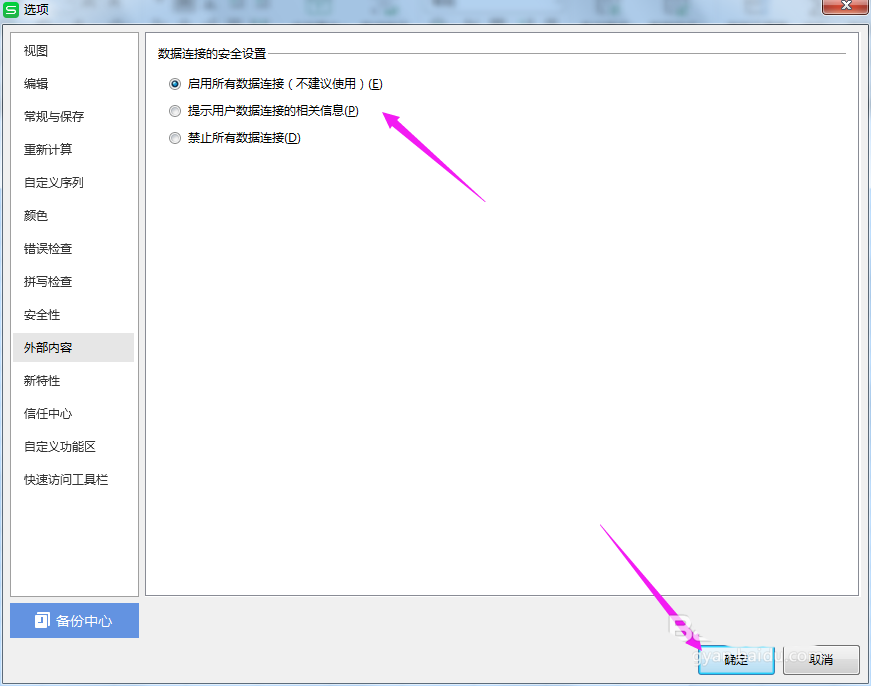 7、我们就可以将【提示用户连接的相关信息】改变,设置为【启用所有数据连接】,如图。
