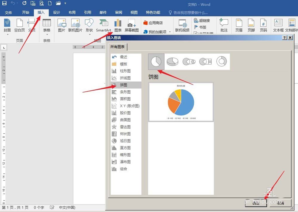 2、点击【插入】—【图表】—【饼图】。