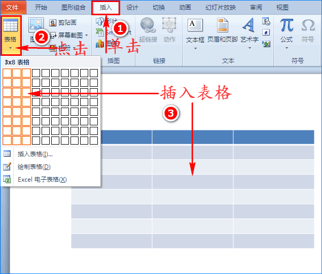 1、打开PPT软件,我们先在幻灯片中插入自己所需的表格(单击“插入”菜单,在其子项中点击“表格”)。如图所示: