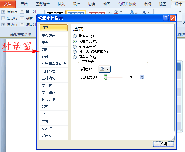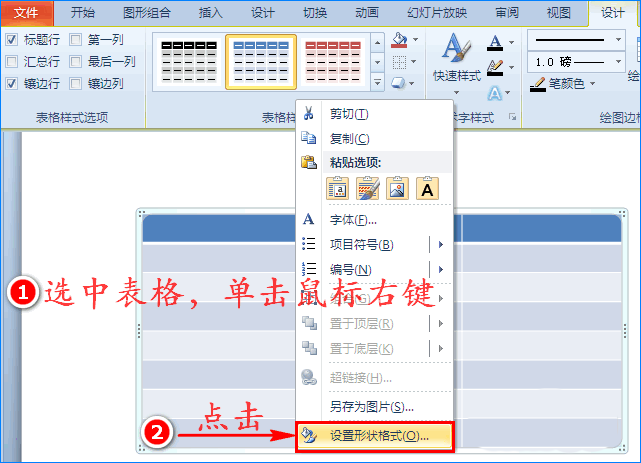 2、接着我们选中表格,单击鼠标右键,在扩展框中选择“设置形状格式”选项,这时会出现对话窗。如图所示: