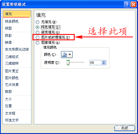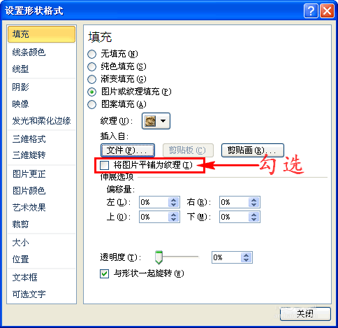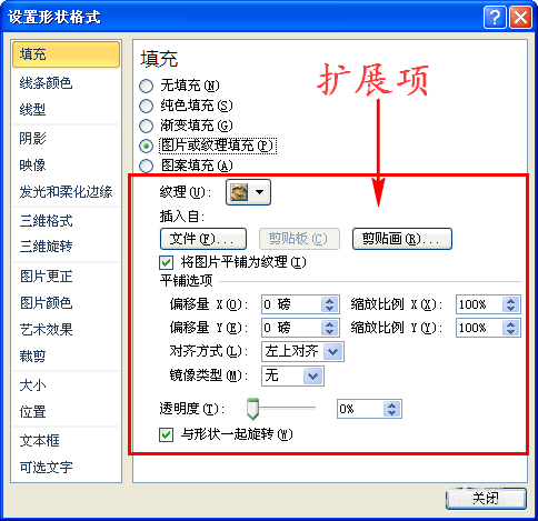 3、然后在对话窗的“填充”界面中我们选择“图片或纹理填充”选项,这样就会出现扩展项。如图所示: