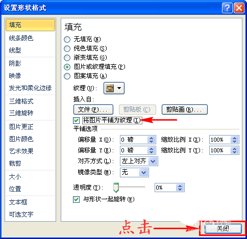 5、返回到之前的对话窗中后,我们勾选扩展项中的“将图片平铺为纹理”,最后关闭对话窗,这样表格就添加了图片。如图所示: