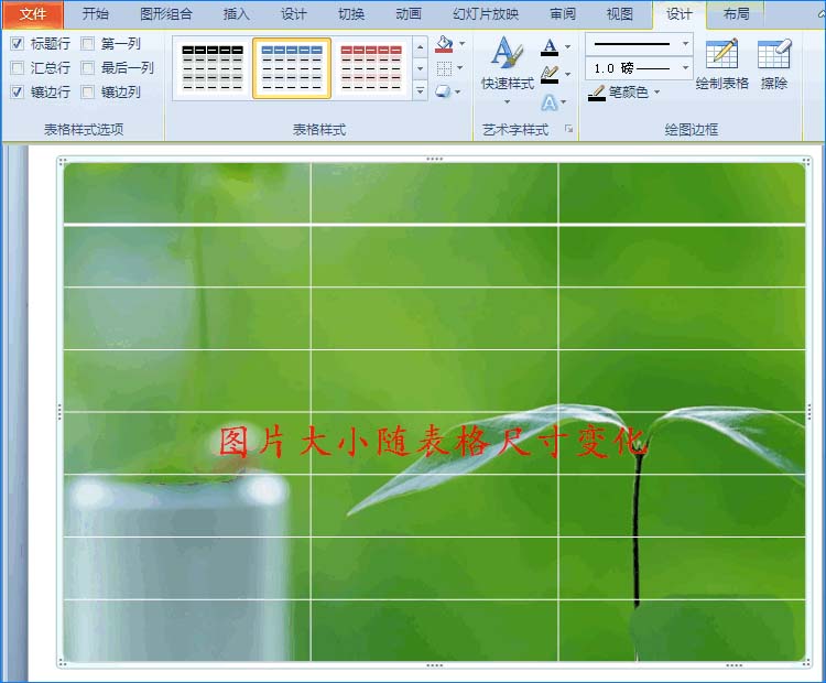 6、随着表格尺寸的改变,添加的图片大小也会随之改变。如图所示: