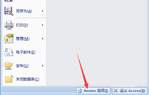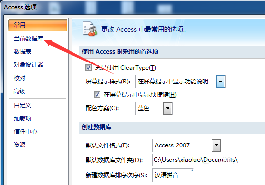 4、弹出了的access选项窗口中,左侧总的当前数据库的选项。