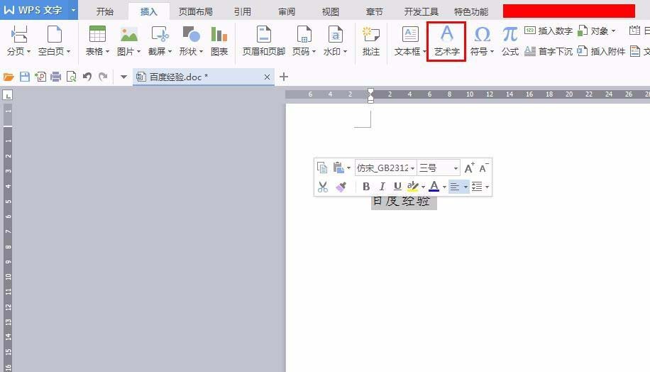 3、选中要设置为弧形的文字,在菜单栏“插入”中选择“艺术字”。