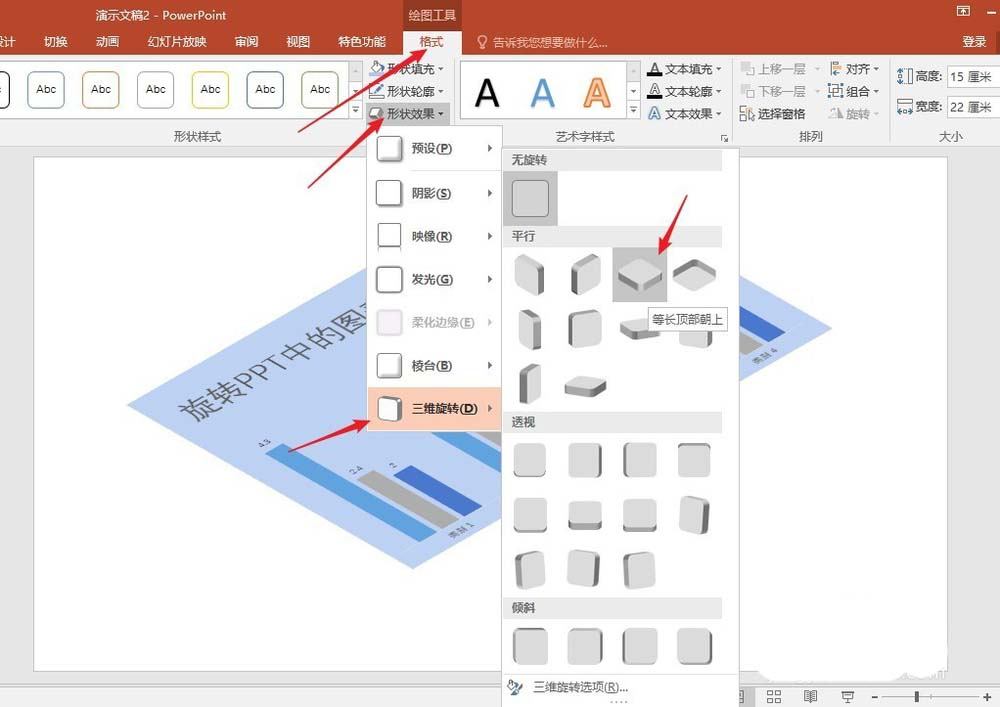 7、选中整体图形,点击【格式】—【形状效果】—【三维旋转】,选择一种三维旋转样式。